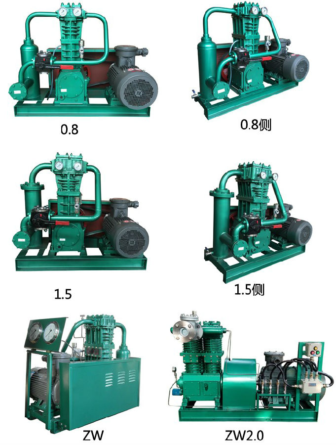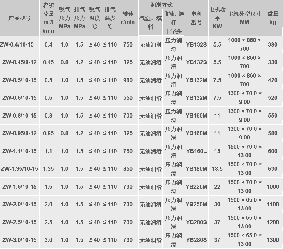 ZW、ZG系列压缩机为立式、风冷、单作用无油润滑往复活塞式,DW/2DG系列压缩机为对称平衡式(其一、二阶段往复惯性力离心力完全平衡)、惯性力矩、离心力矩小等特点。