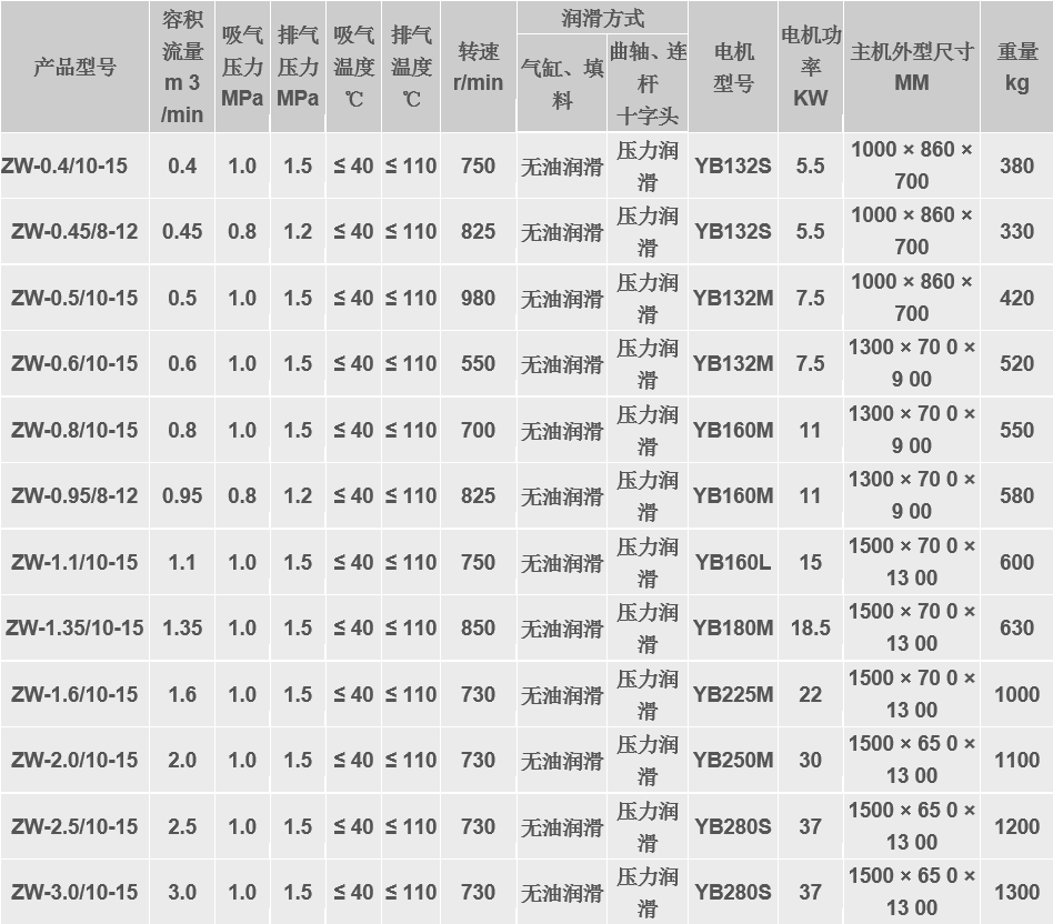 ZW、ZG系列压缩机为立式、风冷、单作用无油润滑往复活塞式,DW/2DG系列压缩机为对称平衡式(其一、二阶段往复惯性力离心力完全平衡)、惯性力矩、离心力矩小等特点。